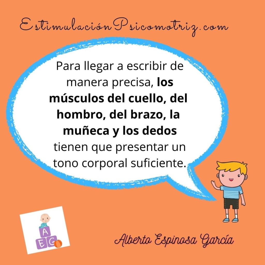 Para llegar a escribir, es necesario que los músculos del cuello, del hombro, del brazo, la muñeca y los dedos se hayan coordinado y que tengan adquirido el tono suficiente ya que, de lo contrario, el movimiento será impreciso.