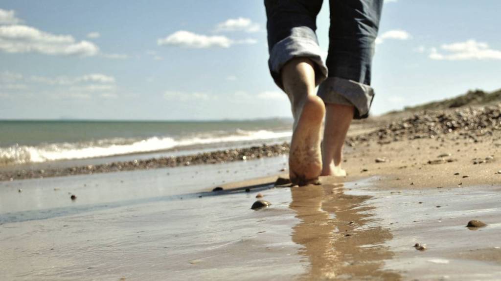 Camina descalzo solo distancias cortas, sobre todo si eres principiante, y ve aumentando poco a poco el recorrido. Si lo haces durante demasiado tiempo, puedes provocar calambres en las piernas y dolor en los tendones y los músculos de los pies. Y hazlo mejor con las olas rompiendo sobre tus tobillos.